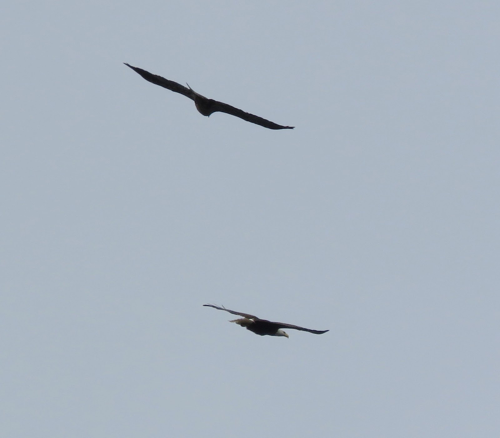 Not sure of these are two eagles, the bottom one is definitely a Bald Eagle I can make out the white head. Not sure about the top bird, could be a hawk that the eagle was chasing away from the nest? Or possibly a juvenile eagle from last year.
